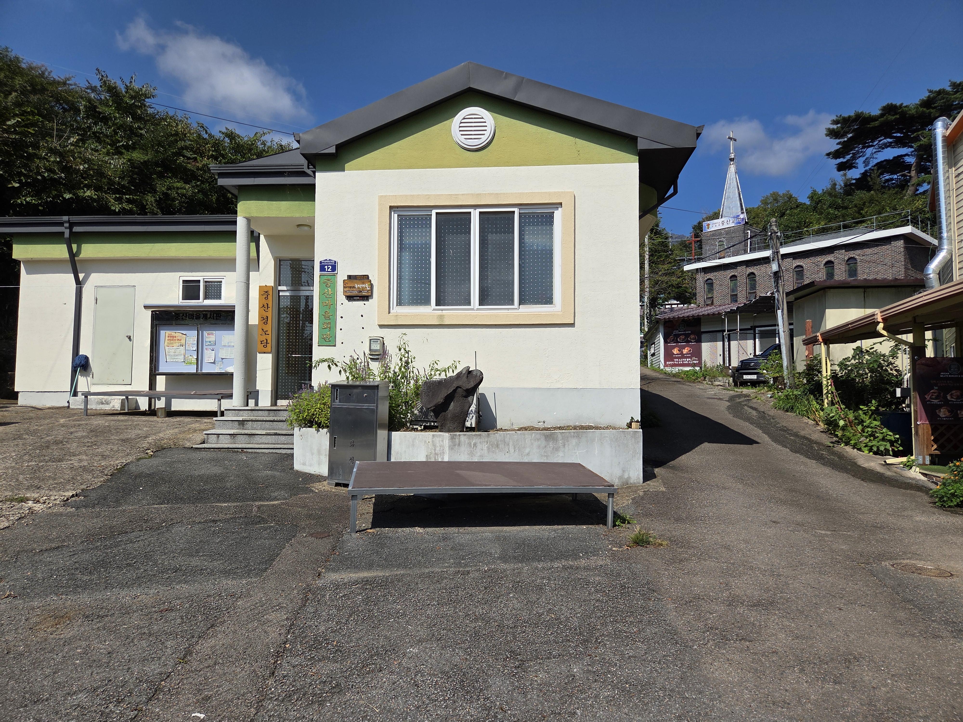 | 마을회관과 교회가 보인다. 사진 아래는 점심으로 주문한 치즈버그와 아이스아메리카노! |